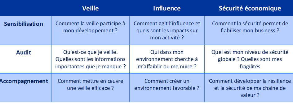 Dans le tableau suivant je propose une matrice de compréhension de l’apport de l’intelligence économique permettant de structurer une démarche IE et d’initier une réflexion sur un SWOT IE.